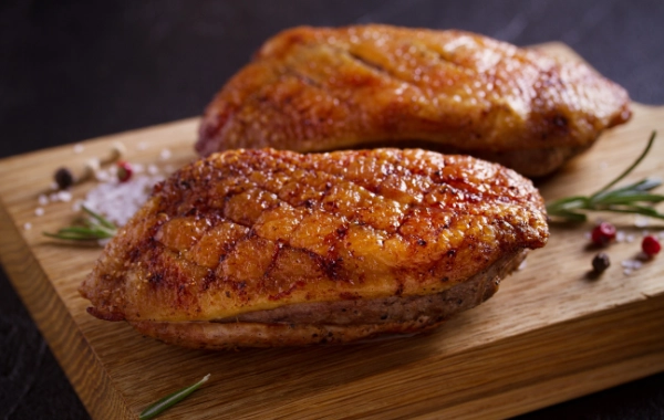 Dry-brined duck breast, finished with a mop during cooking and a final glaze.